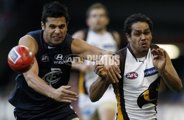 Carlton's Setanta O'hAilpan and Hawthorn's Rhan Hooper compete for a ball during the AFL Round 09 match between the Carlton Blues and the Hawthorn Hawks at Etihad Stadium, Melbourne.