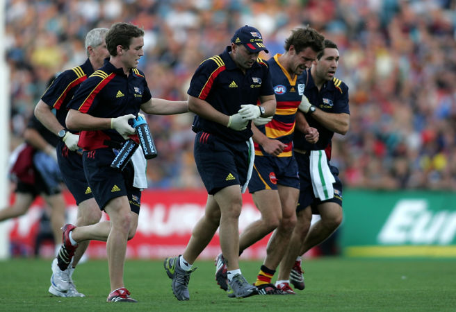 Luke Jericho leaves the field with the assitance of trainers during the AFL Round 03 match between the Adelaide Crows and Port Adelaide Power at AAMI Stadium.