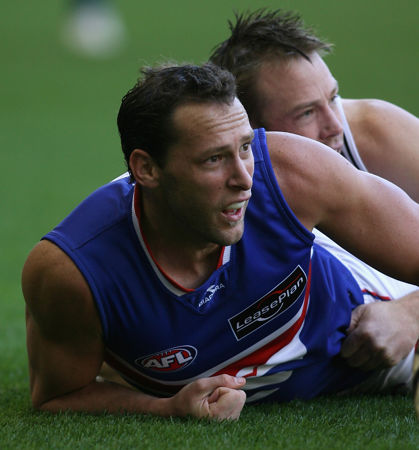 Mitch Hahn of the Western Bulldogs and Max Hudghton of St Kilda in action during the AFL Round 11 match between the St Kilda Saints and the Western Bulldogs at the Telstra Dome.
