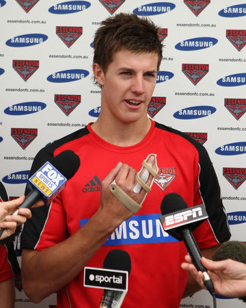 Essendon recruit Tyson Slattery shows his injured hand to the media after an Essendon training session at Bundoora in Melbourne.