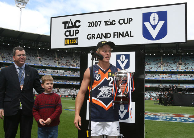 Mitchell Farmer of the Calder Cannons makes a victory speech after winning the 2007 TAC Cup Grand Final between the Calder Cannons and the Murray Bushrangers at the MCG.