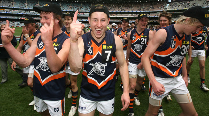 Marcus White (L), James Polkinghorne (#7) and Aaron Kite (#30) celebrate after winning the 2007 TAC Cup Grand Final between the Calder Cannons and the Murray Bushrangers at the MCG.