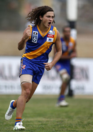 Luke Dahlhaus of Williams town celebrates a goal during the VFL Round 06 match between Williamstown and Sandringham at Chirnside Park, Melbourne.