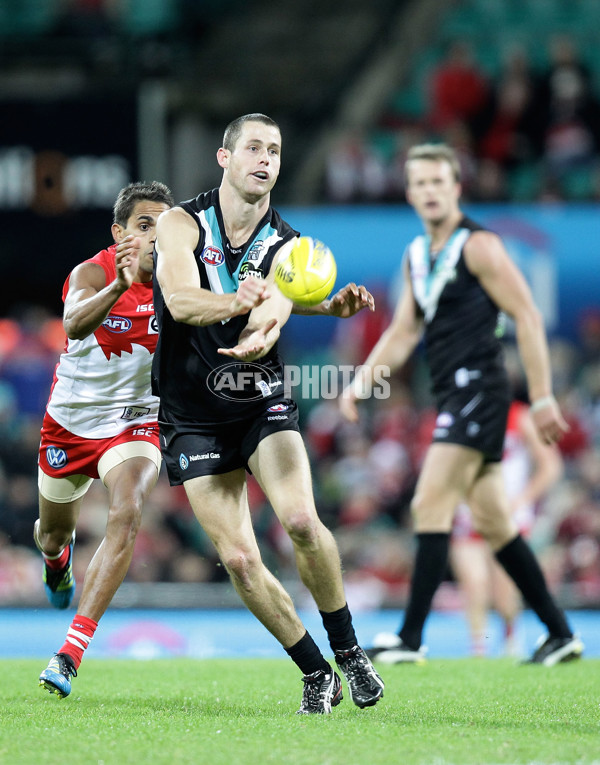 Michael Pettigrew of Port Adelaide offloads as he comes under pressure from Lewis Jetta of Sydney Swans during the AFL Round 08 match between the Sydney Swans and Port Adelaide Power at the SCG, Sydney.