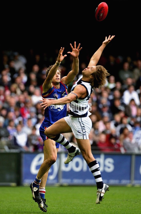 Daniel Cross of the Bulldogs and Will Slade of the Cats contest the mark during the round four AFL match between the Western Bulldogs and the Geelong Cats at the Telstra Dome April 22, 2006 in Melbourne, Australia.