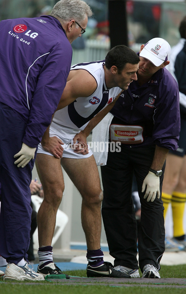 Shane Parker after leaving the field with what appeared to be a groin injury during the Round 4 AFL match between the Melbourne Demons and Fremantle Dockers at the Melbourne Cricket Ground.