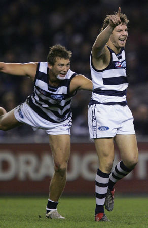 Cameron Thurley of the Cats celebrates kicking a goal during the round eight AFL match between the Carlton Blues and the Geelong Cats at the Telstra Dome May 13, 2005 in Melbourne, Australia.