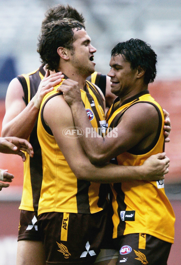 Mark Williams and Harry Miller of the Hawks celebrate a goal during the round 17 AFL match between the Hawthorn Hawks and the Carlton Blues at the Melbourne Cricket Ground July 23, 2005 in Melbourne, Australia.