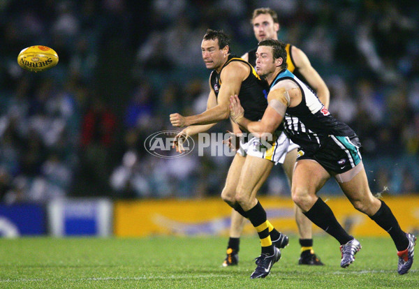 Mark Chaffey of the Tigers gets tackled by Stuart Dew of the Power during the round 17 AFL match between the Port Adelaide Power and the Richmond Tigers at AAMI Stadium July 23, 2005 in Adelaide, Australia.