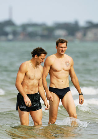 Mitch Hahn and Daniel Bandy leaves the water during the Western Bulldogs recovery session at the Port Melbourne Life Saving Club April 11, 2005 in Melbourne, Australia.