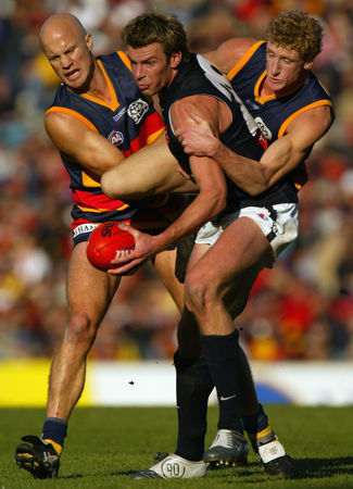 Ian Prendergast of the Blues is tackled by Nigel Smart and Brett Burton of the Crows during the round 11 AFL match between the Adelaide Crows and the Carlton Blues at the AAMI Stadium June 5, 2004 in Adelaide, Australia.