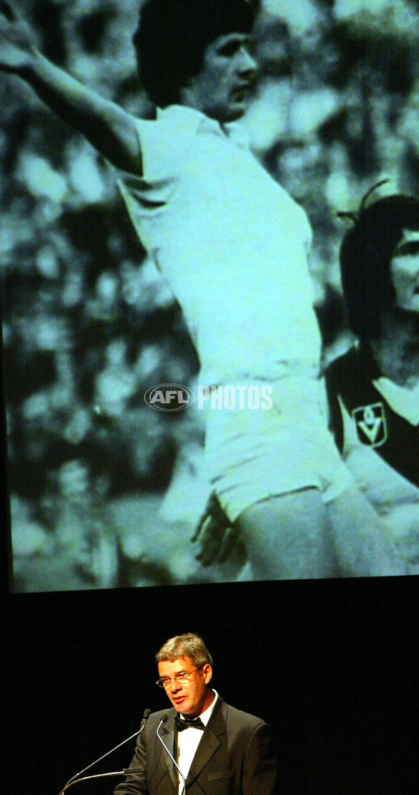 Rowan Sawers is inducted into the AFL Hall of Fame during the AFL Hall of Fame Induction Dinner at the Regent Theatre on June 7, 2004 in Melbourne, Australia.