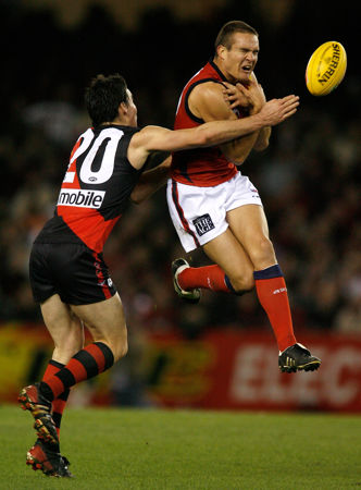 Simon Godfrey from Melbourne and Henry Slattery from Essendon in action during the AFL Round 13 match between the Essendon Bombers and Melbourne Demons at the Telstra Dome.