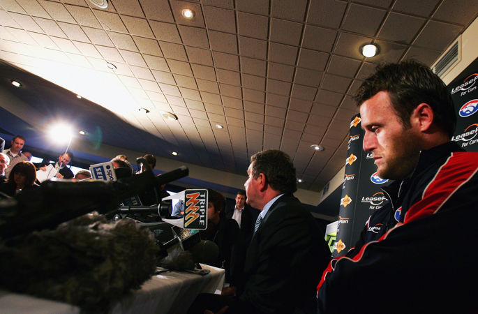 Chris Grant team captain of the Bulldogs looks dejected after the announcement of the termination of the team coach Peter Rohde's contract during the Western Bulldogs press conference at Whitten Oval on August 4, 2004 in Melbourne, Australia.