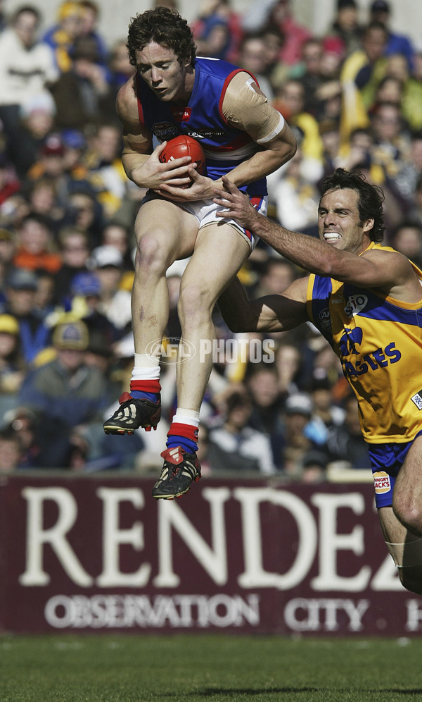 Robert Murphy of the Bulldogs marks ahead of Drew Banfield for the Eagles during the round 18 AFL match between the West Coast Eagles and the Western Bulldogs at the Subiaco Oval August 01, 2004 in Perth, Australia.