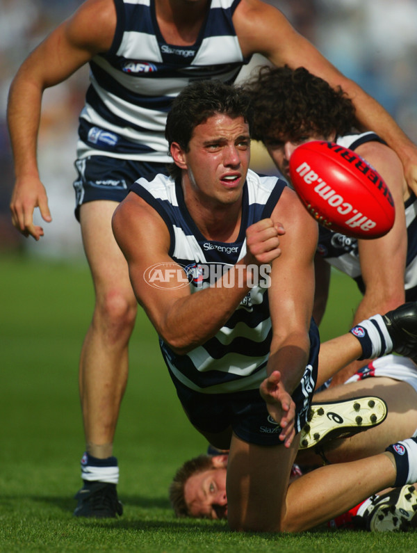 Brent Grgic for the Cats handballs clear of a pack during the round four AFL match between the Geelong Cats and the Melbourne Demons at Skilled Stadium, Geelong, Australia on April 19, 2003,