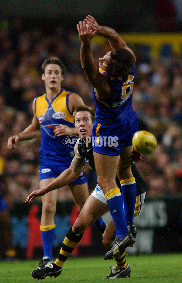 Drew Banfield of the Eagles stretches for the ball in front of Adam Houlihan for the Tigers during the round nine AFL match between the West Coast Eagles and Richmond at the Subiaco Oval May 24, 2003 in Perth, Australia.