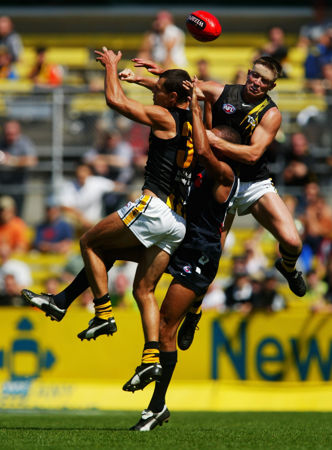Justin Murphy of the Blues is caught between Andrew Kellaway #39 and Matthew Rogers of the Tigers during the AFL practice match between the Carlton Blues and the Richmond Tigers at the Optus Oval in Melbourne, Australia on March 8, 2003.