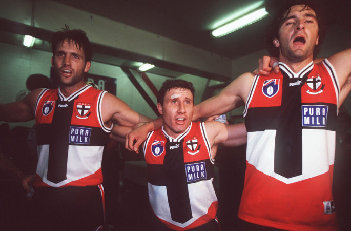 Darryl Wakelin, Tony Francis and Tim Elliot for St Kilda celebrate in the rooms after winning the round seven AFL match between the St Kilda Saints and the West Coast Eagles at Waverley Park in Melbourne on May 8, 1999.