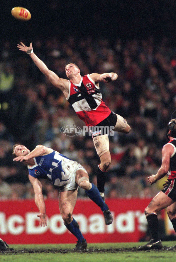 Brett Cook of St Kilda wins the tap over John Longmire of North Melbourne during the AFL Second Preliminary Final between the St Kilda Saints and North Melbourne at the Melbourne Cricket Ground on September 19, 1997.