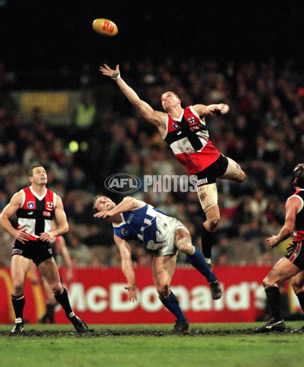 Brett Cook of St Kilda wins the tap over John Longmire of North Melbourne during the AFL Second Preliminary Final between the St Kilda Saints and North Melbourne at the Melbourne Cricket Ground on September 19, 1997.