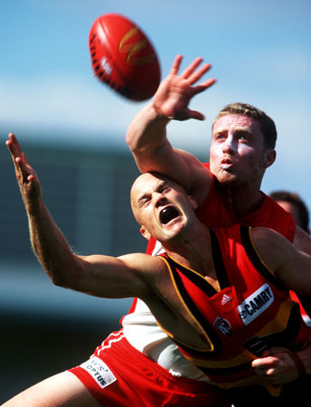 Nigel Smart of Adelaide Crows and Ryan O'Connor of Sydney compete for the mark during the AFL practice match between the Sydney Swans and the Adelaide Crows at the Griffith Oval in Griffith on February 19, 2000.