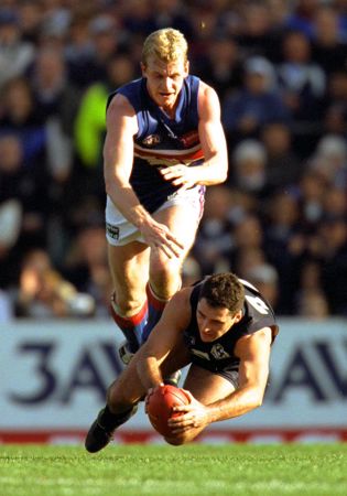 Trent Hotton for Carlton dives to take a mark in front of Scott Wynd for the Western Bulldogs during the round 19 AFL match between the Carlton Blues and the Western Bulldogs at the Optus Oval in Melbourne on July 15, 2000.