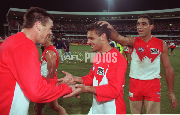Robert Ahmat of Sydney is congratulated by team mates Brad Seymour and Adam Goodes after the round 20 AFL match between the Sydney Swans and the Kangaroos at the Sydney Cricket Ground on July 22, 2000.