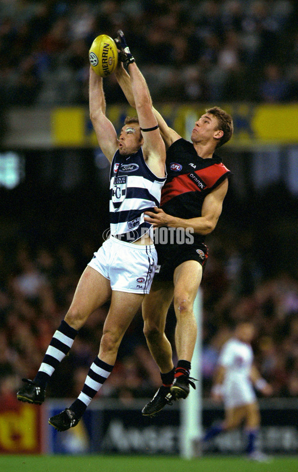 David Mensch for Geelong marks in front of Aaron Henneman for Essendon during the round 15 AFL match between the Essendon Bombers and the Geelong Cats at the Colonial Stadium in Melbourne on July 15, 2001.
