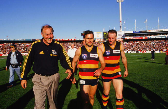 Malcolm Blight, Matthew Liptak and Rod Jameson farewell the crowd on their last match for the Crows after the 1999 round 22 AFL match between the Adelaide Crows and the Kangaroos at Football Park.