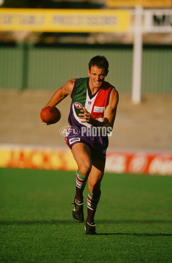 Simon Eastaugh of the Dockers runs the ball during a 2001 AFL Fremantle Dockers training session.