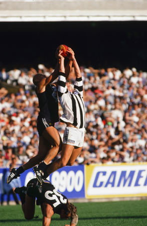 Milham Hanna of the Blues takes a mark over Bradley Plain of the Magpies during the 1990's AFL match between the Carlton Blues and the Collingwood Magpies.