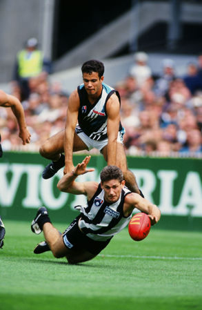 Shane Bond of Port flies over Gavin Crosisca of the Magpies during the 1997 round 1 AFL match between the Collingwood Magpies and the Port Adelaide Power.