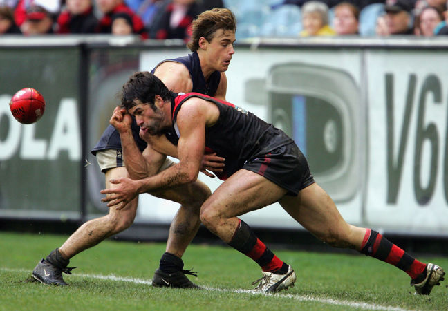 Dean Solomon for the Bombers gets a handball away despite pressure from Brett Johnson for the Blues during the round 19 AFL match between the Essendon Bombers and the Carlton Blues at the Melbourne Cricket Ground August 7, 2004 in Melbourne, Australia.
