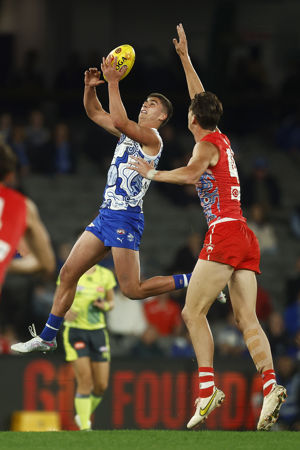 MELBOURNE, AUSTRALIA - MAY 20: Harry Sheezel of the Kangaroos handballs under pressure from Lachlan McAndrew of the Swans during the round 10 AFL match between North Melbourne Kangaroos and Sydney Swans at Marvel Stadium, on May 20, 2023, in Melbourne, Australia. (Photo by Daniel Pockett/Getty Images via AFL Photos)