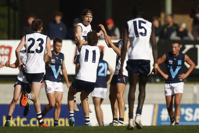 MELBOURNE, AUSTRALIA - JUNE 10: Harry Morphet of Victoria Country (C) celebrates kicking the winning goal during the AFL National Development Championships U16 match between Victoria Country and Victoria Metro at Trevor Barker Beach Oval on June 10, 2023 in Melbourne, Australia. (Photo by Daniel Pockett/AFL Photos)