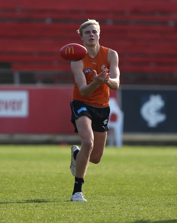MELBOURNE, AUSTRALIA - JUNE 16: Harry Lemmey of the Blues handballs during a Carlton Blues AFL training session at Ikon Park on June 16, 2023 in Melbourne, Australia. (Photo by Robert Cianflone/Getty Images via AFL Photos)