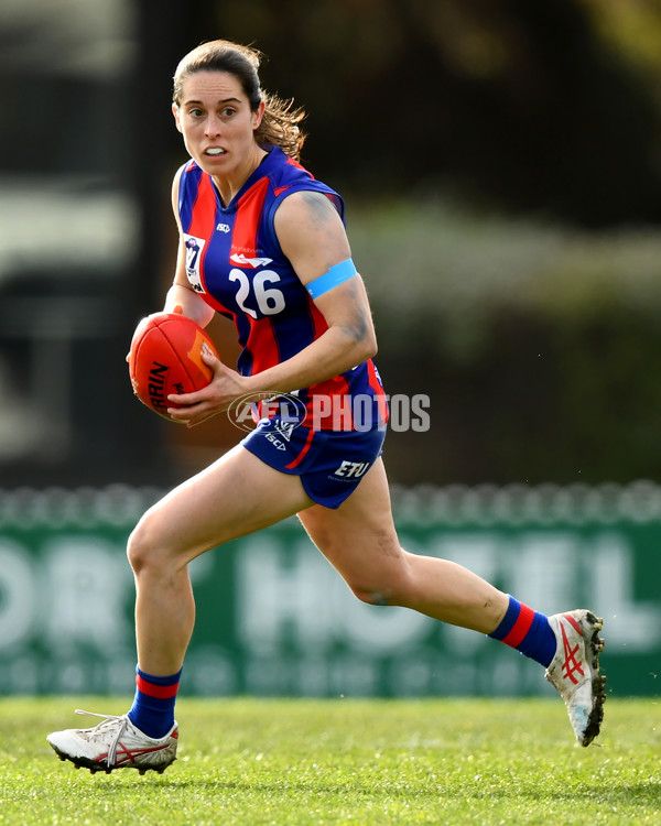MELBOURNE, AUSTRALIA - JULY 23: Jessie Williams of Port Melbourne runs with the ball during the 2023 VFLW Preliminary Final match between Essendon and Port Melbourne at ETU Stadium on July 23, 2023 in Melbourne, Australia. (Photo by Josh Chadwick/AFL Photos)