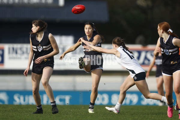 MELBOURNE, AUSTRALIA - AUGUST 09: Alannah Fyfe of Caulfield Grammar kicks the ball during the 2023 Herald Sun Shield: Division 1 Senior Girls Grand Final match between Caulfield Grammar and Melbourne Girls Grammar at Trevor Barker Beach Oval on August 09, 2023 in Melbourne, Australia. (Photo by Daniel Pockett/AFL Photos)