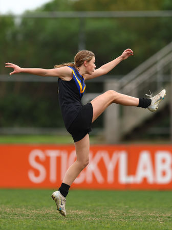 MELBOURNE, AUSTRALIA - AUGUST 10: Ruby Kaye of Carey Grammar kicks a goal during the 2023 Herald Sun Shield Intermediate Girls Grand Final match between Sacred Heart College Geelong and Carey Grammar at Trevor Barker Oval on August 10, 2023 in Melbourne, Australia. (Photo by Graham Denholm/AFL Photos)