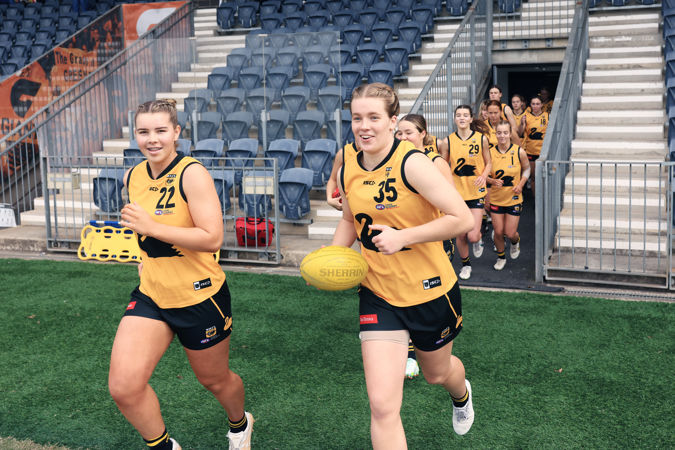 SYDNEY, AUSTRALIA - AUGUST 13: Olivia Wolmarans of Western Australia and Anjelique Raison of Western Australia lead their team out during the AFL National Championships U18 match between Allies and Western Australia at Blacktown International Sportspark on August 13, 2023 in Sydney, Australia. (Photo by Mark Evans/AFL Photos)