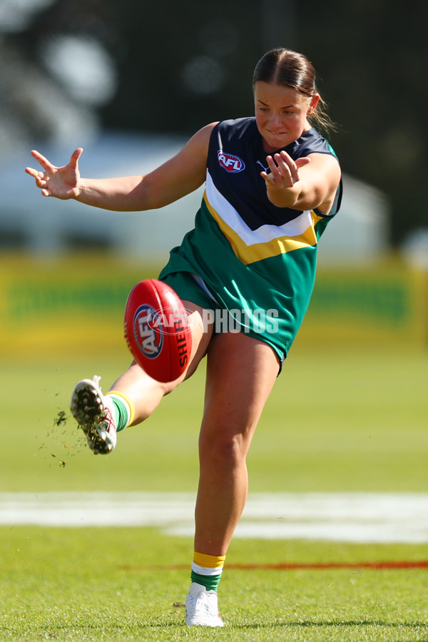 MELBOURNE, AUSTRALIA - SEPTEMBER 02: Jemma Whitington-Charity of Team Schleicher kicks during the AFLW Futures match between Team Harris and Team Schleicher at Kinetic Stadium on September 02, 2023 in Melbourne, Australia. (Photo by Graham Denholm/AFL Photos)