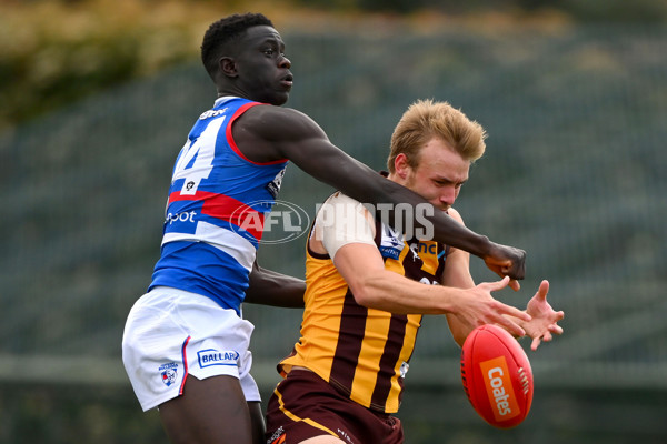 MELBOURNE, AUSTRALIA - SEPTEMBER 09: Buku Khamis of the Bulldogs spoils a marking attempt from Joshua Morris of the Hawks during the 2023 VFL Semi Final match between the Box Hill Hawks and the Footscray Bulldogs at Box Hill City Oval on September 09, 2023 in Melbourne, Australia. (Photo by Morgan Hancock/AFL Photos)