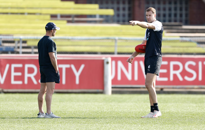 MELBOURNE, AUSTRALIA - SEPTEMBER 14: Head of Fitness Andrew Russell and Harry McKay of the Blues chat in action during the Carlton Blues training session at Ikon Park on September 14, 2023 in Melbourne, Australia. (Photo by Michael Willson/AFL Photos)