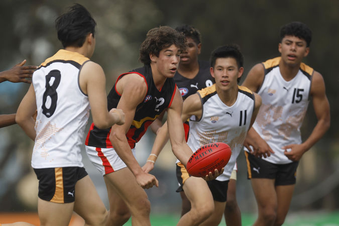 MELBOURNE, AUSTRALIA - SEPTEMBER 19: Crix Johnston of Flying Boomerangs handballs under pressure during Game 1 of the 2023 AFL Flying Boomerangs v World Team Diversity Series exhibition games at Trevor Barker Oval on September 19, 2023 in Melbourne, Australia. (Photo by Daniel Pockett/AFL Photos/Getty Images via AFL Photos)