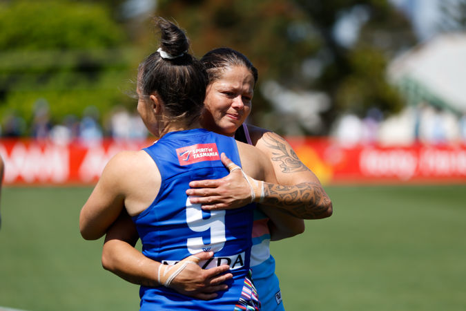 MELBOURNE, AUSTRALIA - NOVEMBER 04: Richelle Cranston of the Bulldogs hugs Emma Kearney of the Kangaroos during the 2023 AFLW Round 10 match between The Western Bulldogs and The North Melbourne Tasmanian Kangaroos at Whitten Oval on November 04, 2023 in Melbourne, Australia. (Photo by Dylan Burns/AFL Photos)