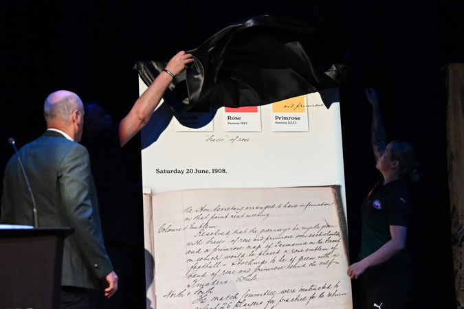VARIOUS CITIES, AUSTRALIA - MARCH 18: Rodney Eade and Jessica Wuetschner unveil the new teams colours during a media opportunity announcing the details for the Tasmanian AFL team, at Hobart Theatre Royal on March 18, 2024 in Various Cities, Australia. (Photo by Steve Bell/Getty Images via AFL Photos)