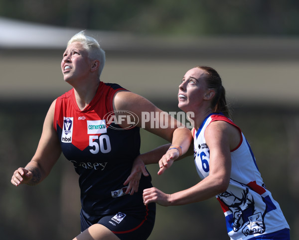 MELBOURNE, AUSTRALIA - MARCH 30: Leah Swain of the Demons and Imogen Milford of the Bulldogs compete in a ruck contest during the 2024 VFLW Round 2 match between the Casey Demons and the Western Bulldogs at Casey Fields on March 30, 2024 in Melbourne, Australia. (Photo by Rob Lawson/AFL Photos)