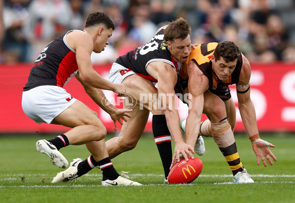 LAUNCESTON, AUSTRALIA - MAY 11: Jack Hayes of the Saints and Lloyd Meek of the Hawks compete for the ball during the 2024 AFL Round 09 match between the Hawthorn Hawks and the St Kilda Saints at UTAS Stadium on May 11, 2024 in Launceston, Australia. (Photo by Michael Willson/AFL Photos)