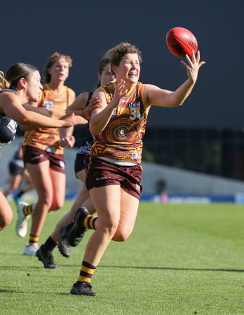 MELBOURNE, AUSTRALIA - MAY 25: Jessica Cox of the Hawks in action during the 2024 rebel VFLW Round 10 match between Carlton and the Box Hill Hawks at IKON Park on May 25, 2024 in Melbourne, Australia. (Photo by Rob Lawson/AFL Photos)